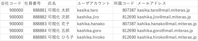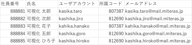 - ユーザを一意に特定するために、社員番号、社員名、ユーザアカウントは重複しないようにしてください。同じ社員の情報の重複登録はできません。