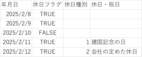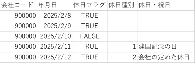 入力文字:半角英数字年月日 必須 カレンダーの年月日です。 入力形式:yyyy/mm/dd 休日フラグ 必須 休日・平日設定を示す文字列を設定する項目です。 TRUE:休日
