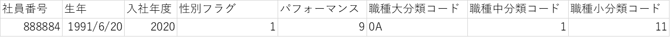 | ユーザ詳細マスタ | ユーザマスタに登録されている利用者の詳細情報(生年、入社年度、性別フラグ、パフォーマンス、職種分類コード)を定義します。 これらの情報を入力する際は、別紙「職種/性別/パフォーマンス一覧.xlsx」に定義されていますので、その値を参考に入力してください。 別紙「職種/性別/パフォーマンス一覧.xlsx」は弊社サポートにお問い合わせください。 |