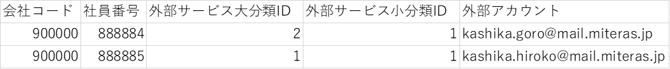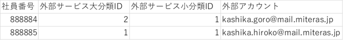 外部アカウント情報(社員番号、外部サービス大分類ID、外部サービス小分類ID、外部アカウント)を定義します。 ※SAML認証・Outlook予定表連携機能を利用する場合に用いる場合があります。 |