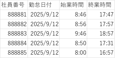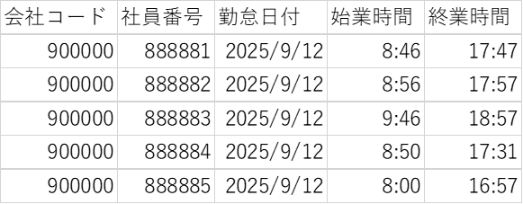 - 勤怠システムから情報をエクスポートした場合、規定のマスタフォーマットに従う必要がありますので登録時に変更をお願いいたします。