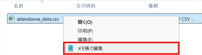 メモ帳で開きたいCSVファイルを右クリックし「メモ帳で編集」をクリックします。
