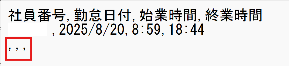 マスタファイルに下記画像のように社員情報・組織情報や勤怠データなどが記録されていないカンマ(,)のみが記載されいる行があった場合、マスタの登録時にエラーが発生します。