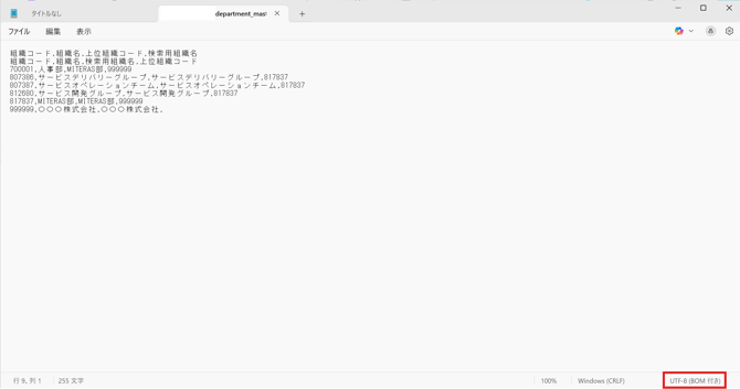 マスタファイルは文字コードがSJIS形式で保存されている必要があります。メモ帳でマスタファイル(CSVファイル)を開くと下記画像の右下の赤枠部分に文字コードが表示されます。例えば文字コードが「UTF-8」と記載されている場合、UTF-8形式でファイルが保存されているため、この形式のままマスタ更新操作を行うとエラーが発生します。