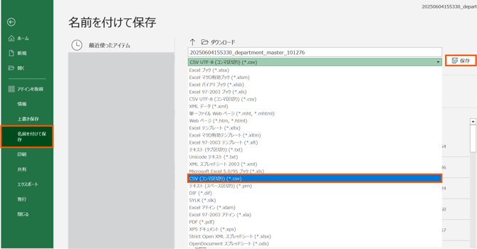 エラーを解消するためには、ファイルの文字コードを変更する必要があります。EXCELで文字コードをSJISに変更する場合は、「名前を付けて保存」を行う際に、下記画像の通り「CSV (コンマ区切り)(*.csv)」を指定して「保存」をクリックします。保存が完了すると文字コードがSJISに変更されるので、再度マスタ更新をお試しください。