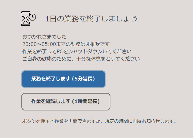 - PCの使用時間が指定時刻を超過した場合、エージェントにより下図のブロック画面が表示されます。