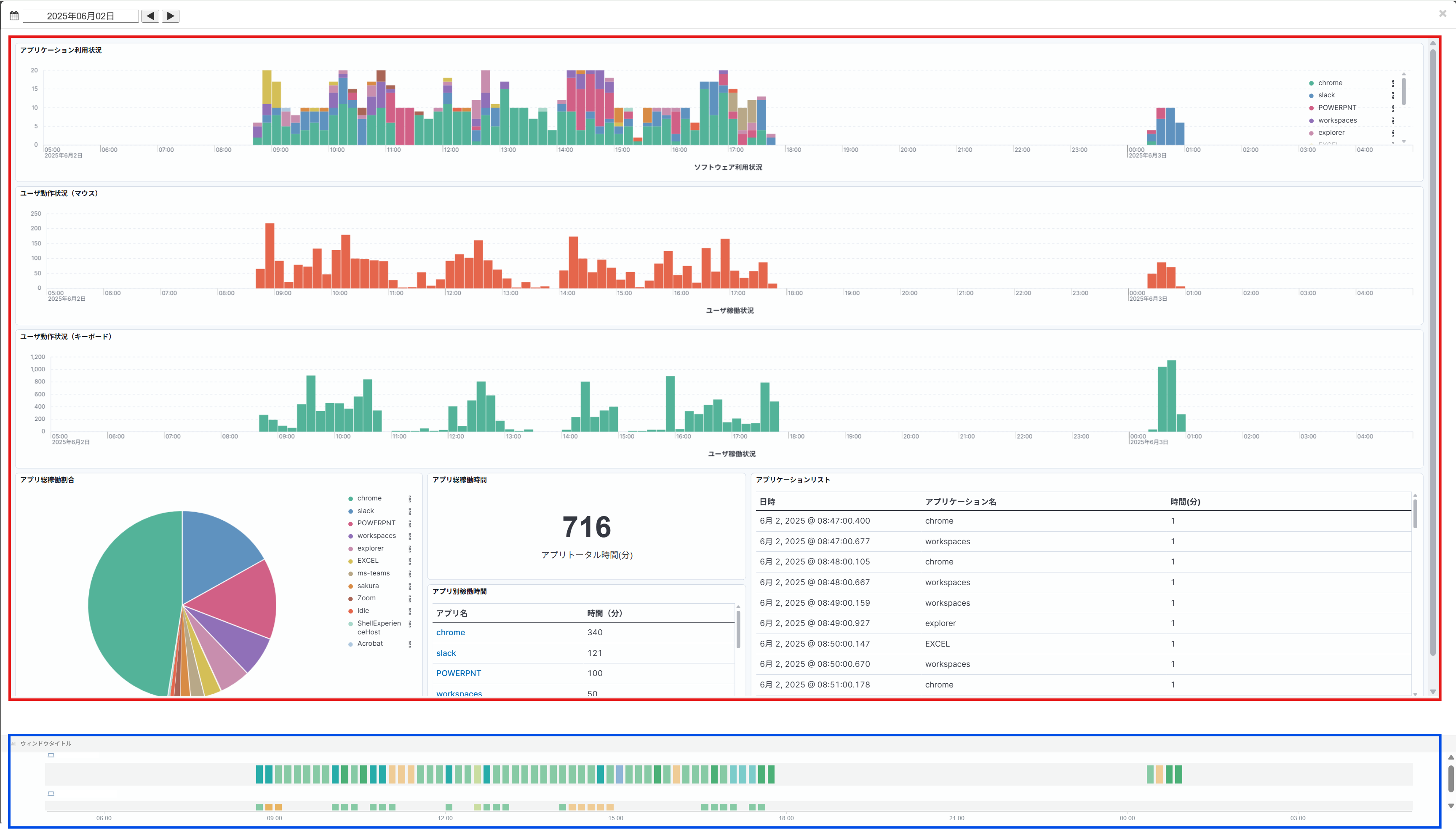 2025/06/03 1人のユーザが同時にPCを複数台利用した場合、Web管理画面のアプリケーション利用状況のグラフ表示はどうなりますか。 赤枠のグラフは複数台分のデータを集計した結果が表示され、青枠のグラフはPC毎に集計した結果が表示されます。